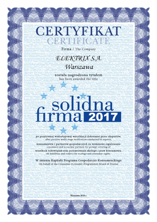 ELEKTRIX S.A. już po raz siódmy otrzymał certyfikat Solidnej Firmy. To specjalne wyróżnienie dla firm poświadczające rzetelność i wiarygodność przedsiębiorstwa.